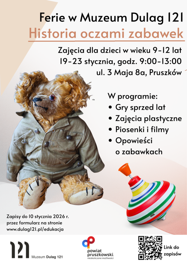 W pierwszym tygodniu ferii zimowych (19-23 stycznia) zapraszamy dzieci w wieku od 9 do 12 lat na cykl warsztatów poświęconych zabawkom i grom z dawnych lat. Czekają nas zajęcia plastyczne, gry ruchowe, śpiewanie piosenek i samodzielne tworzenie zabawek inspirowanych wspomnieniami świadków historii.