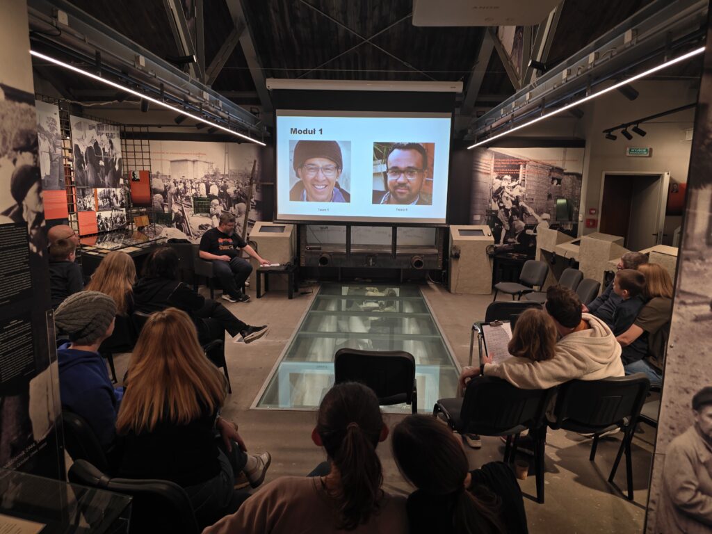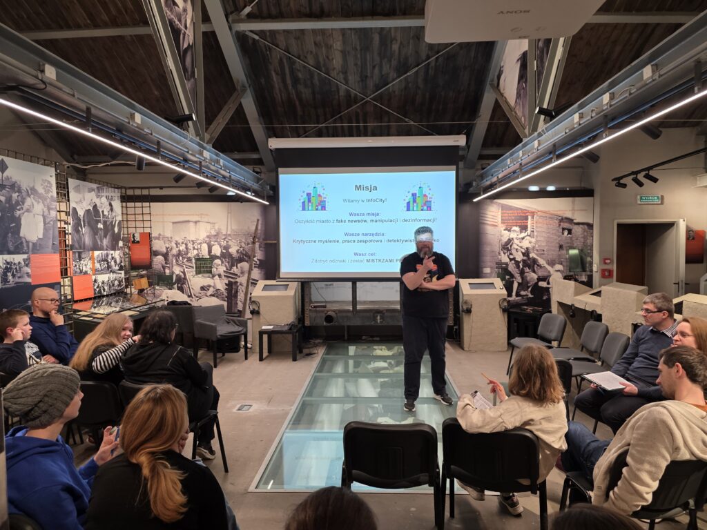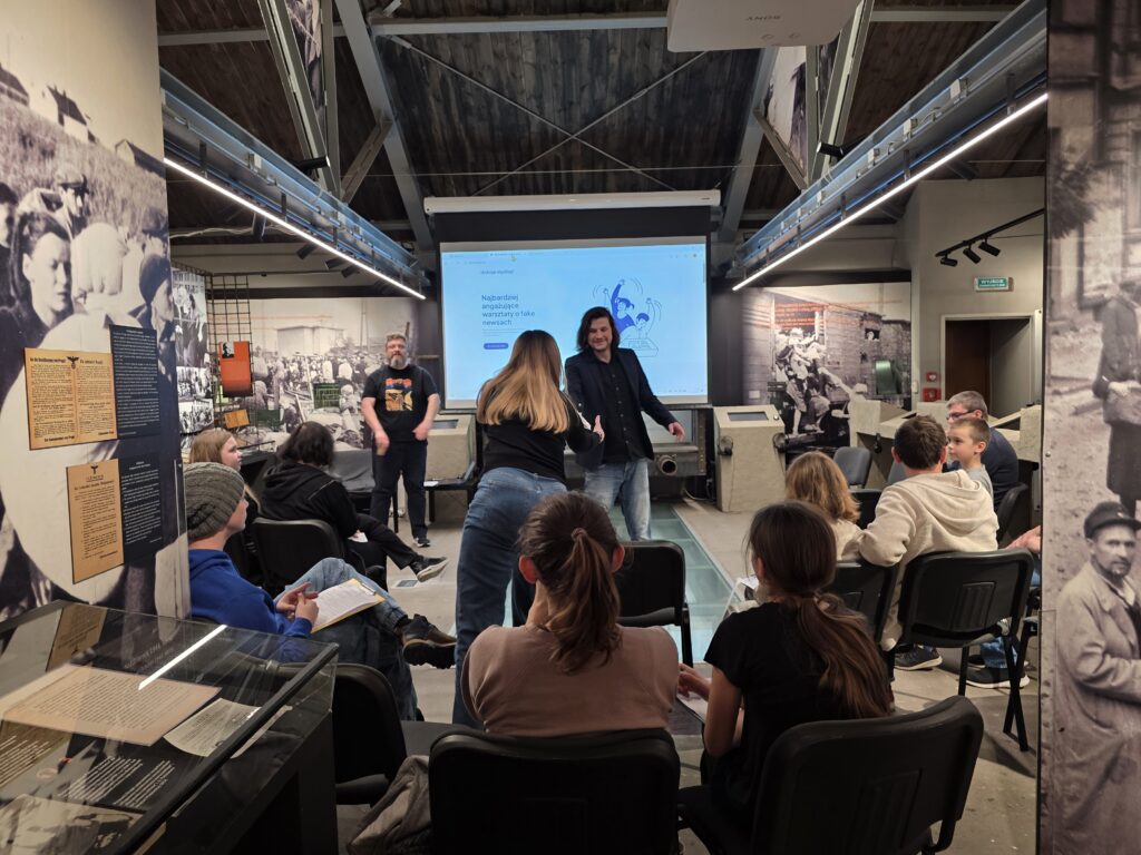 Poważny temat połączyliśmy z lekką i angażującą formą gry z nagrodami. Prowadzący najpierw przybliżył nam, w jaki sposób fałszywe informacje były rozpowszechniane w historii, a następnie omówił kilka nieuczciwych praktyk z naszych czasów – od metody „na wnuczka”, przez generowane komputerowo filmiki, aż po rosyjskie farmy botów.